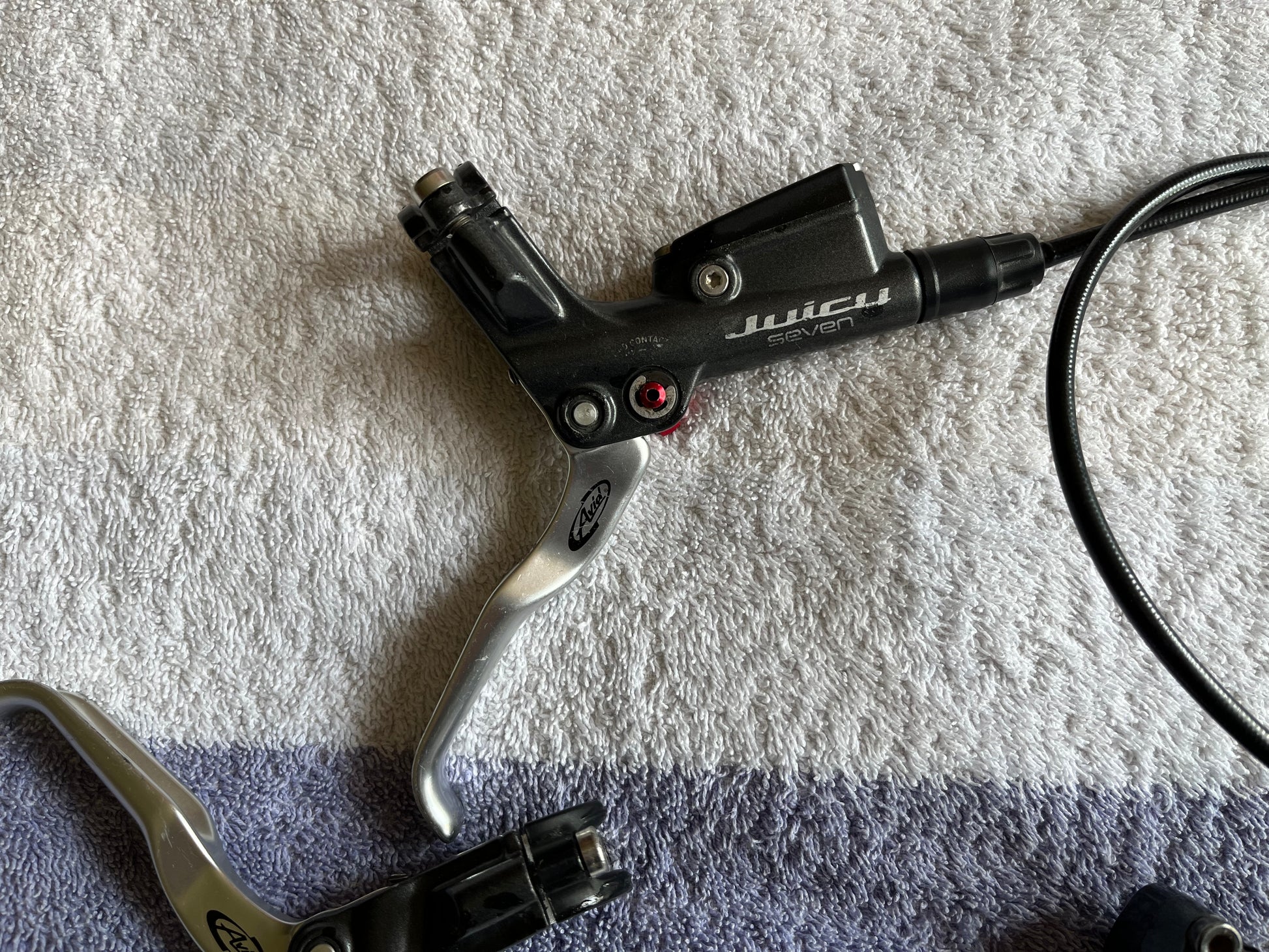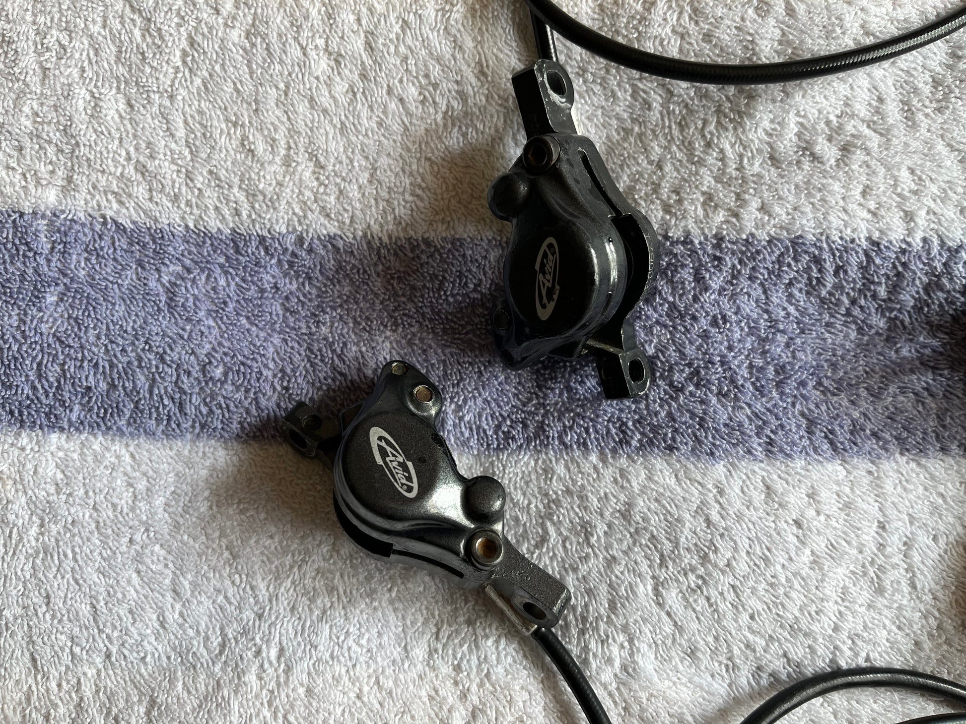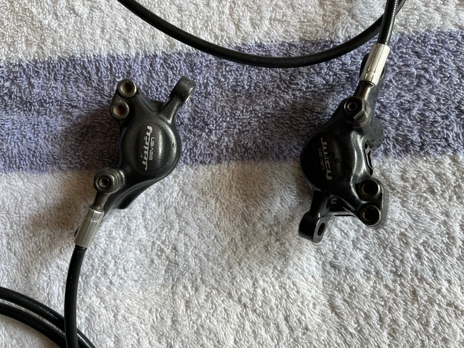 - the brakes have been bled: A juicy bleed block was inserted into the calipers, the brake levers set to the bleed positions and the pad contact adjuster turned so that the pistons are pushed as far as possible toward the bleed blocks