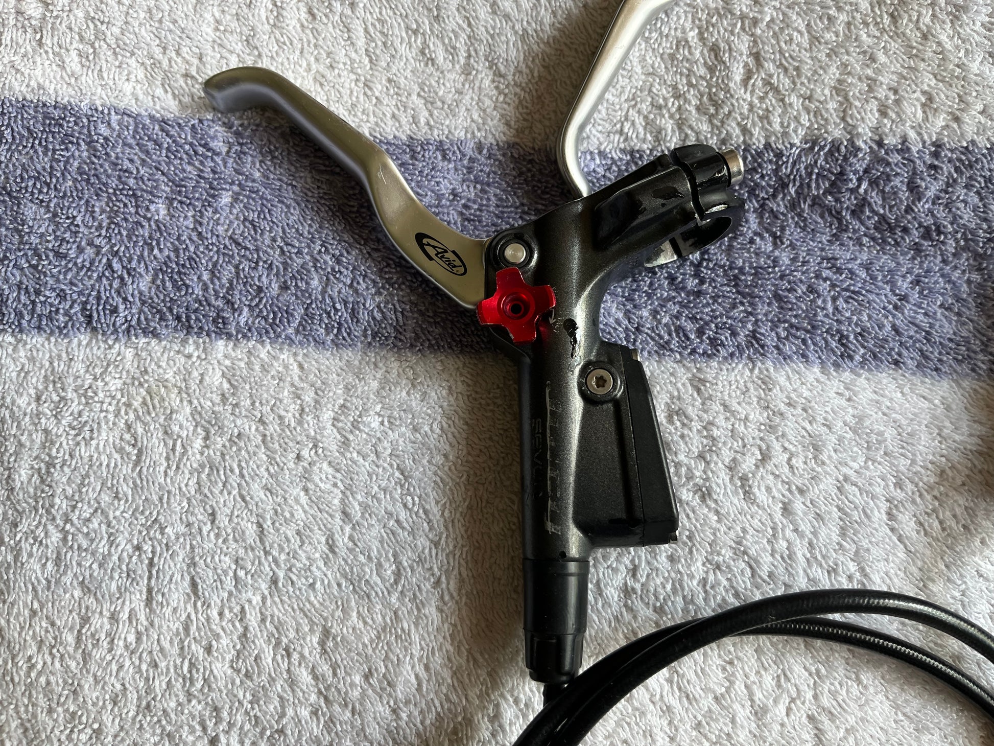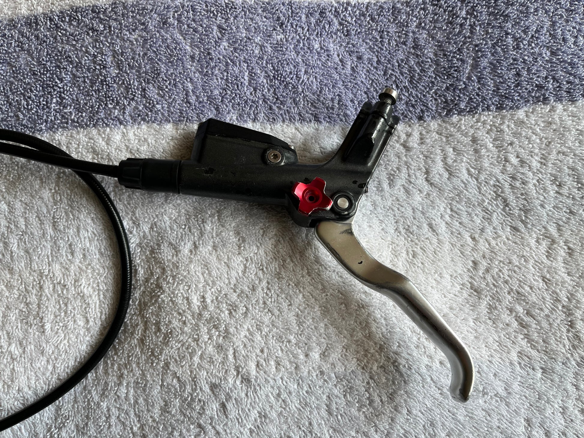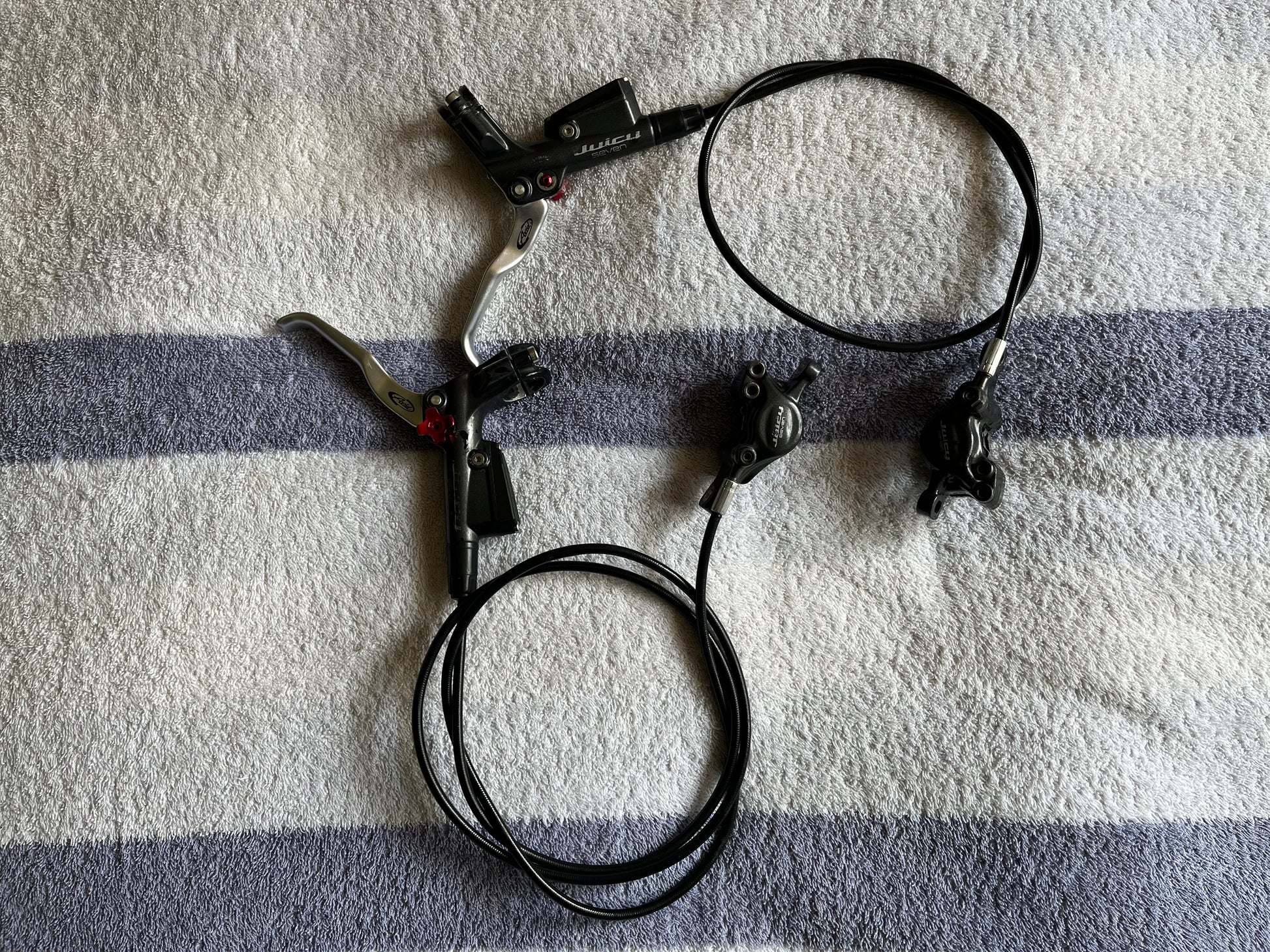- the brakes have been bled: A juicy bleed block was inserted into the calipers, the brake levers set to the bleed positions and the pad contact adjuster turned so that the pistons are pushed as far as possible toward the bleed blocks