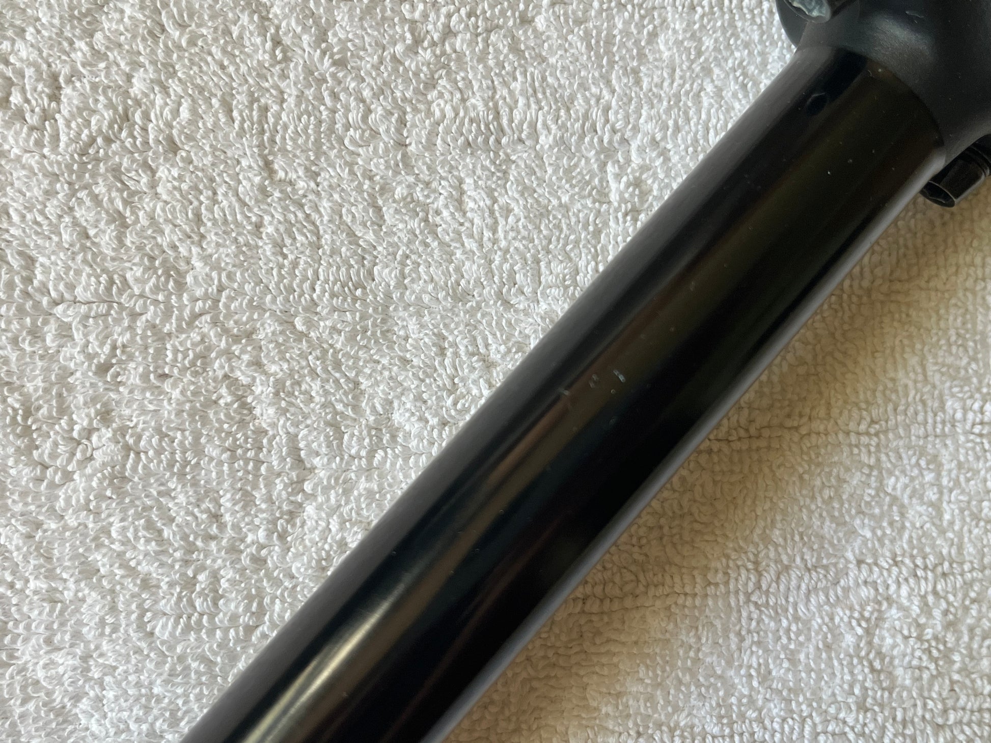 - Note: the dropper has four tiny dings and scratches from the bicycle having fallen over. The fall removed black coating and the silver has been touched up with black paint (see photos)