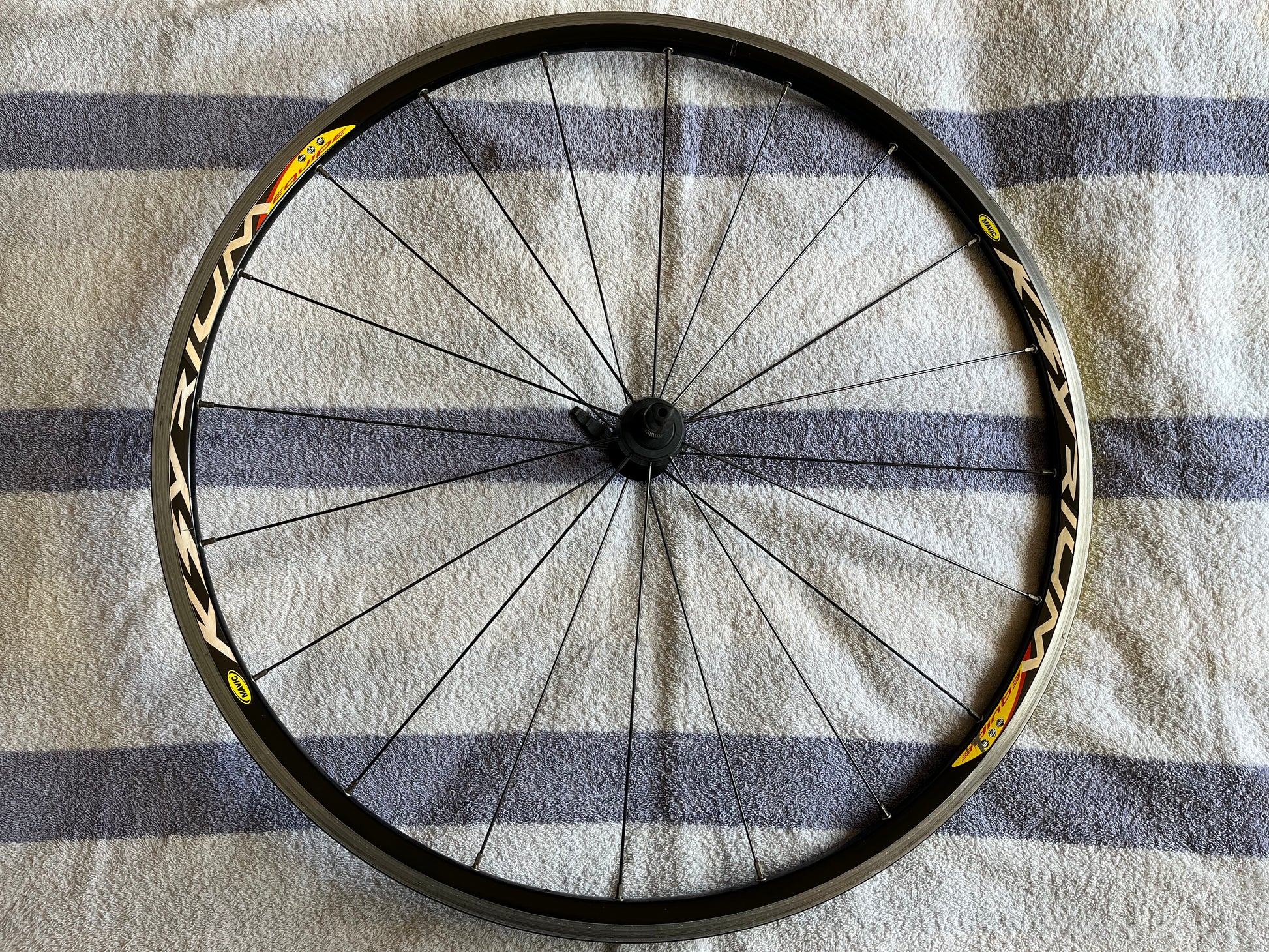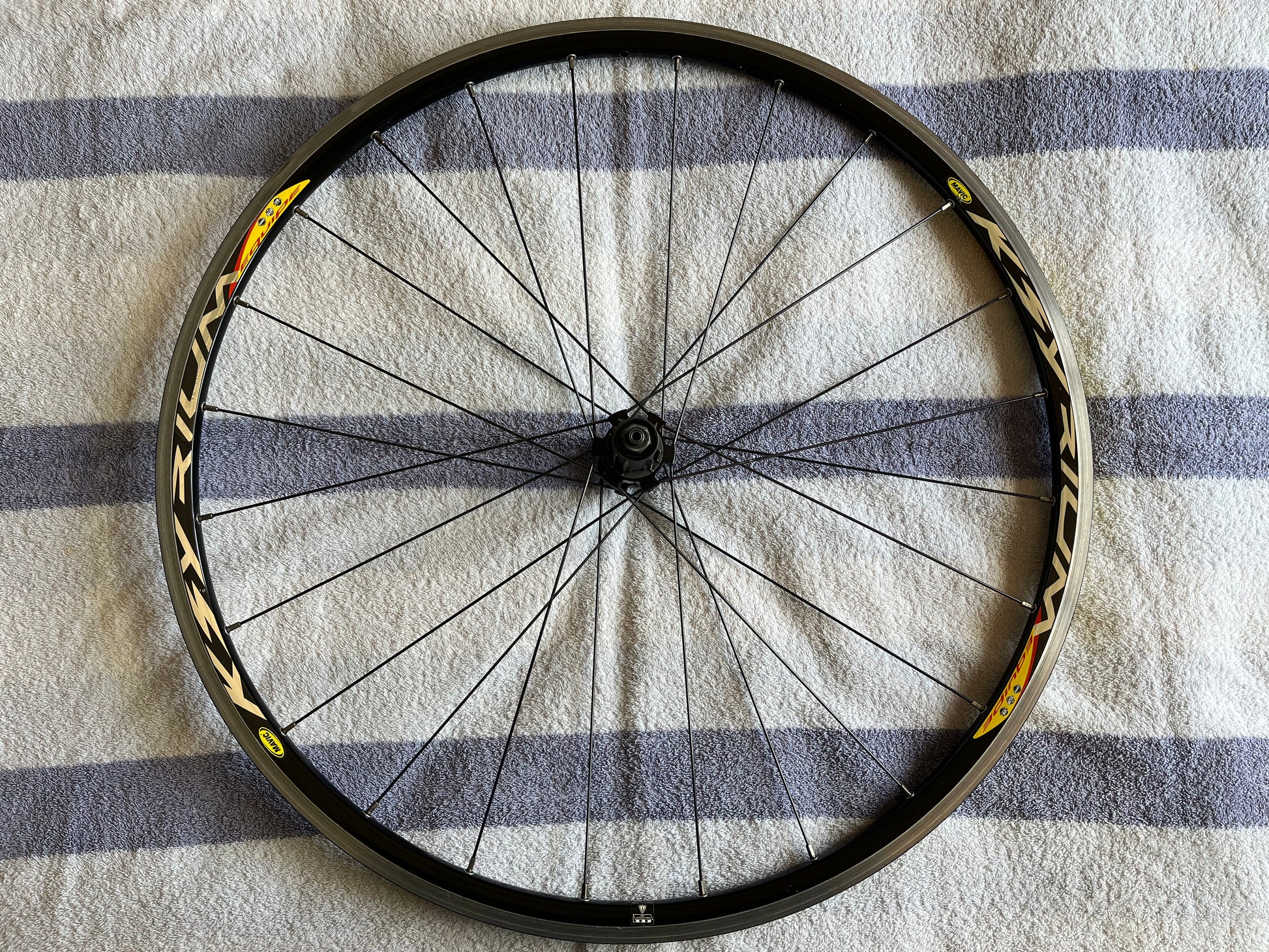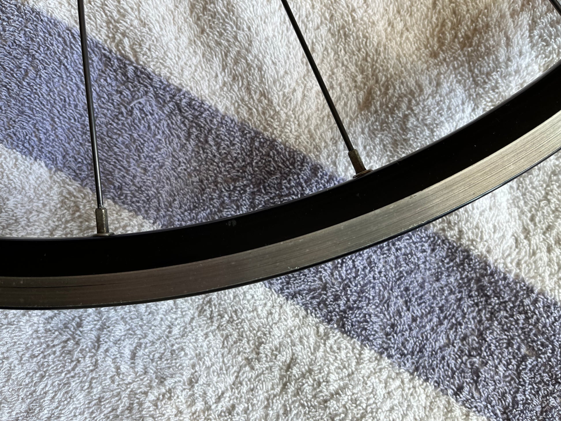- the previous owner used a bicycle carrier strap that scratched the front rim surface only between the nipples. This has been touched up with black paint