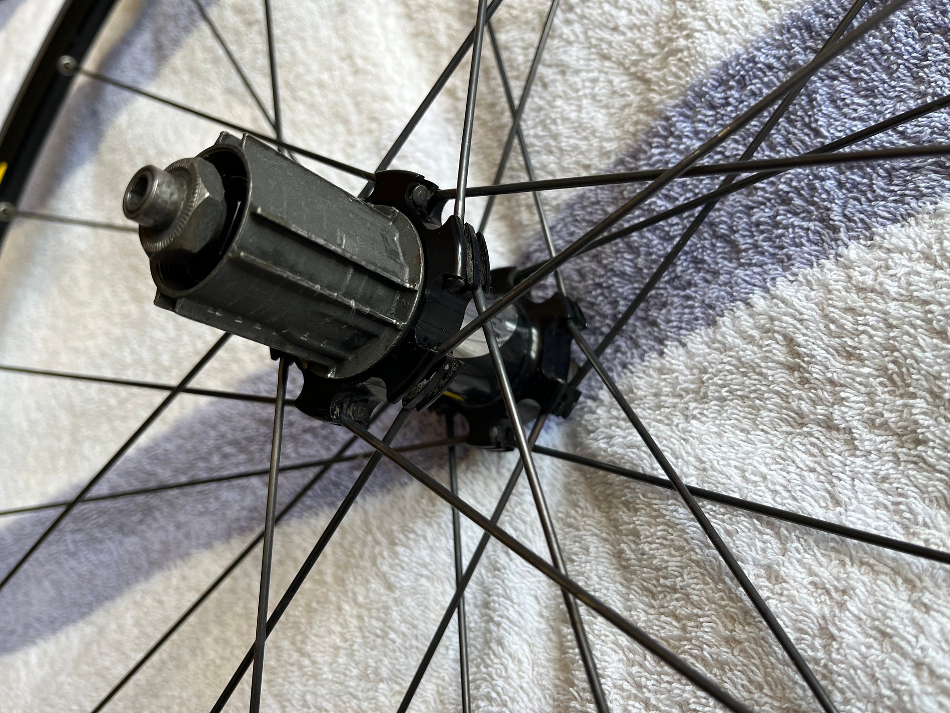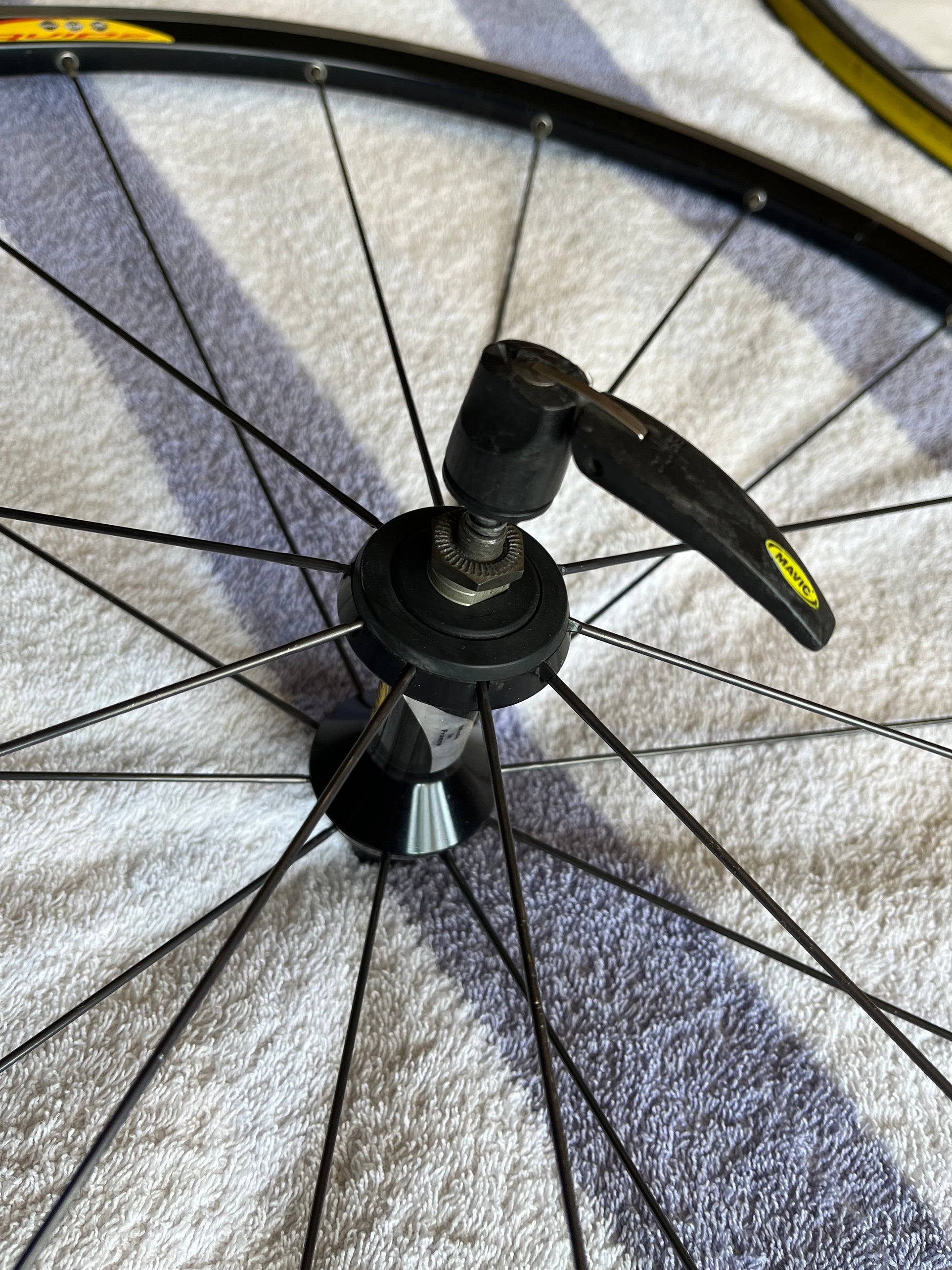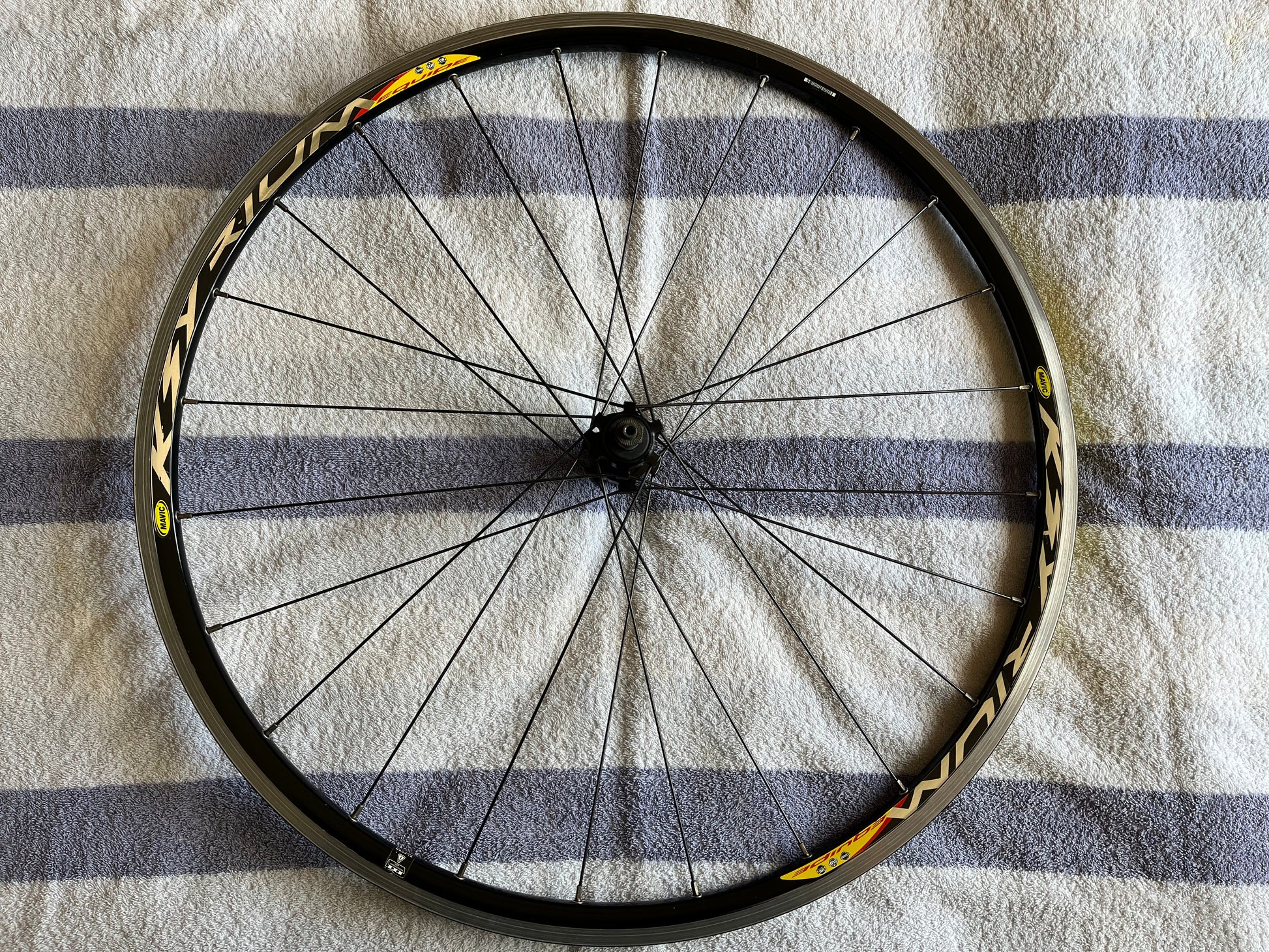 - the previous owner used a bicycle carrier strap that scratched the front rim surface only between the nipples. This has been touched up with black paint